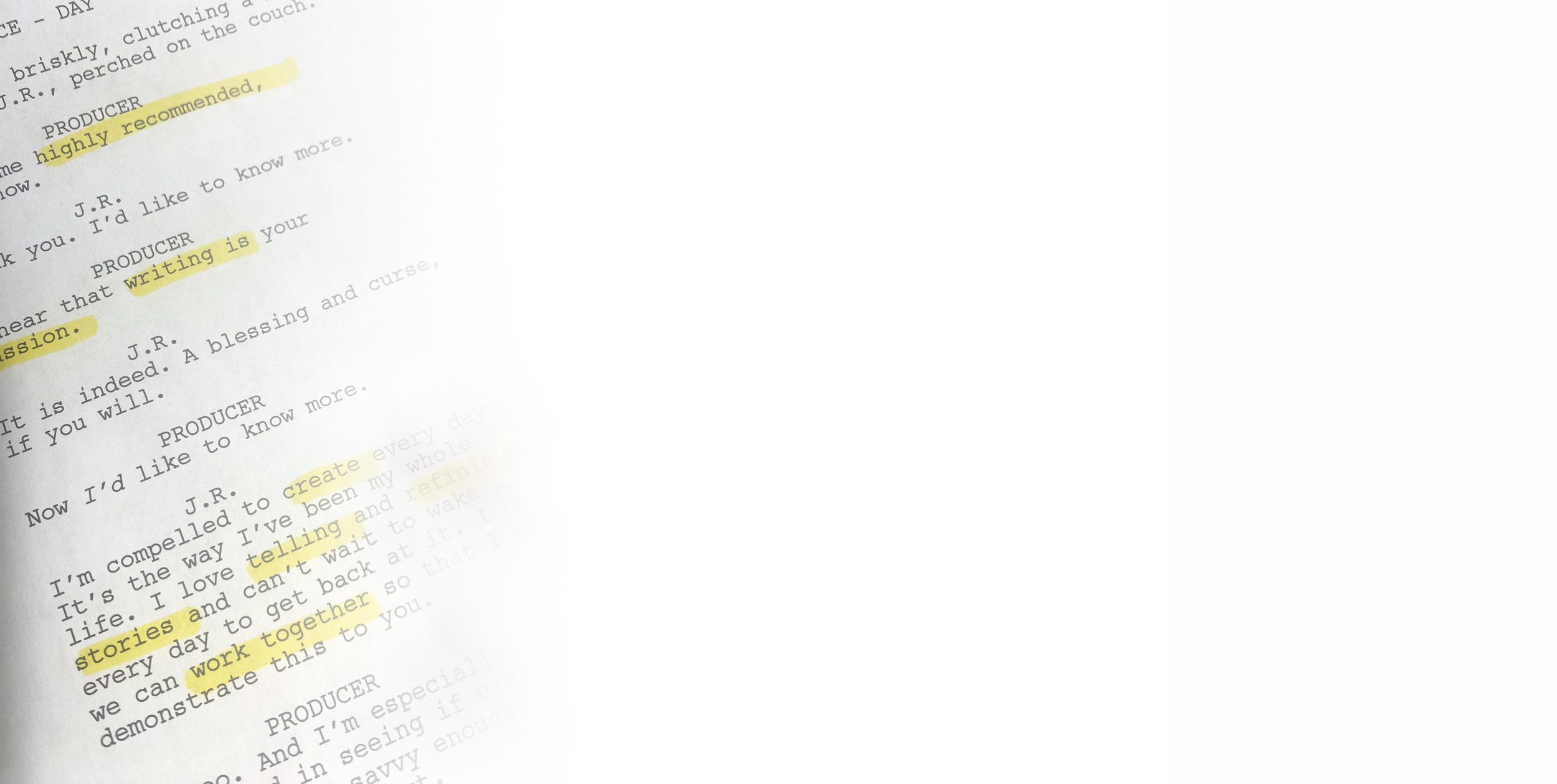 Whatever the stage, I can assist in defining your story, creating outlines, treatments, dialogue, structural maps and help generate a first - or final - draft. I specialize in literary adaptations and offer ghostwriting services as desired.